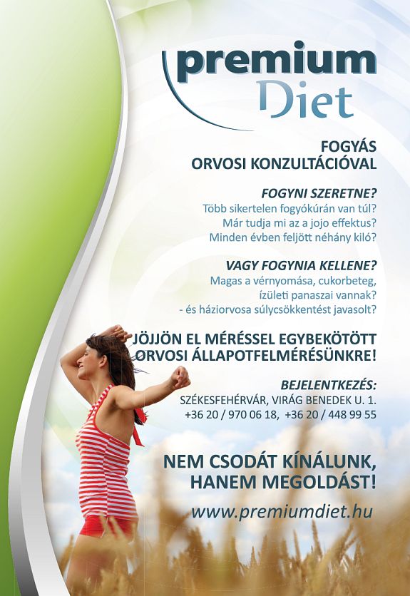 Az egészséges súlycsökkenés a köztes étkezések elhagyása által létrejövő, aktív zsírégetésen alapszik. Bevált étrend kiegészítőknek és az orvosi útmutatásnak köszönhetően nem lép fel a jojó-effektus. A Premium diéta az egyetlen diétás módszer, amiben elsősorban a testzsír épül le és közben megmarad az izomzat és a fittség.