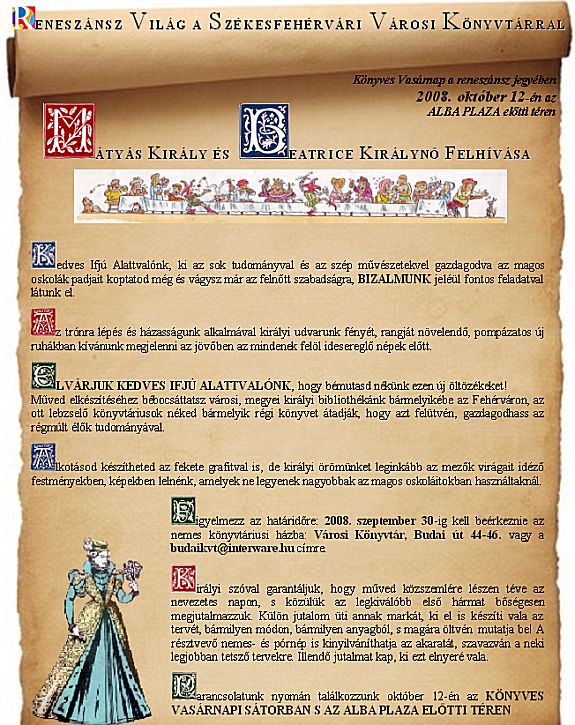 Ennek keretében pályázatot hirdet a könyvtár reneszánsz stílusú ruhák tervezésére, a középiskolás korosztálynak. A ruhaterveket A/3-as méretben várják szeptember 30-ig a könyvtárba (Szfvár, Budai út 44-46.) papíron, vagy elektronikus formában a budaikvt@interware.hu címre. Elkészítéséhez bármilyen technika felhasználható, aki meg is valósítja az elképzelt tervet, az külön díjazásban részesül! A beérkezett pályaműveket szakértő zsűri bírálja el, a legjobbak értékes nyereményben részesülnek.