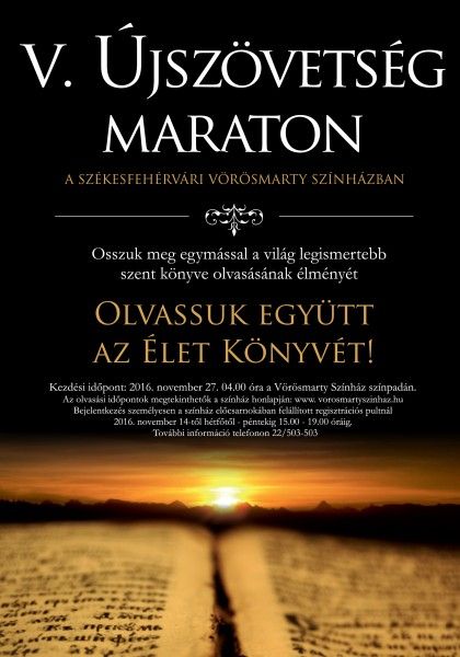 A karácsonyi készülődés jegyében ismét Újszövetség Maratont rendez a Vörösmarty Színház november 27-én vasárnap hajnali 4 órától. Advent első hétvégéjén több mint húsz órán át olvassák fel az Újszövetséget a nagyszínpadon. Az érdeklődők a színház honlapján keresztül, vagy személyesen a színház előcsarnokában felállított regisztrációs pultnál jelentkezhetnek az eseményre november 14-én hétfőtől 15 és 19 óra között.