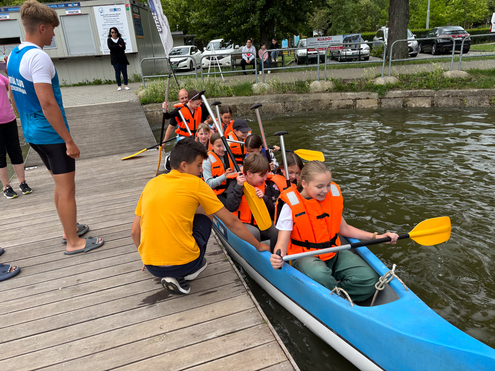 Egy testnevelésóra alatt megtanulhatják a diákok azt, hogy mi a kajak és a kenu között a különbség, melyik lapátot hogyan kell fogni, és stabil, biztonságos hajókban ki is próbálhatják a két szakágat, így szinte pár perccel az érkezés után már vízen is voltak a Szent Imre Iskola 4/a-sai.
