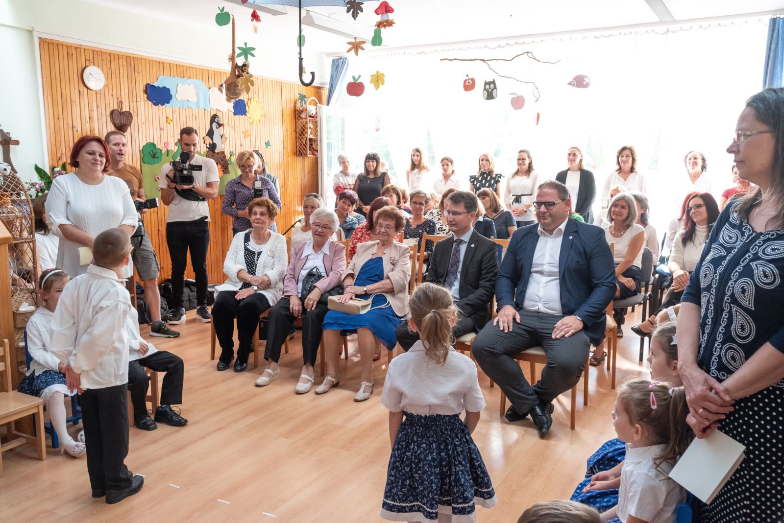 A Pillangó csoportba járó gyerekek zenés, táncos, verses műsora után dr. Cser-Palkovics András polgármester köszöntötte a jubiláló intézményt, és emlékezett vissza az elmúlt évtizedekre. Mint fogalmazott: az előző városvezetők komoly feladatot kaptak azzal, hogy az egykor 60 ezer lakosú város viszonylag hamar, körülbelül két évtized alatt 120 ezer fősre nőtt. Rengeteg lakás épült, és meg kellett oldani a városlakók kiszolgálását. Sok esetben az oktatási-nevelési intézmények előbb épültek meg a lakásoknál, és elkezdték fogadni a gyerekeket, óriási segítséget nyújtva ezzel az idetelepült, vagy a más településről bejáró családoknak.