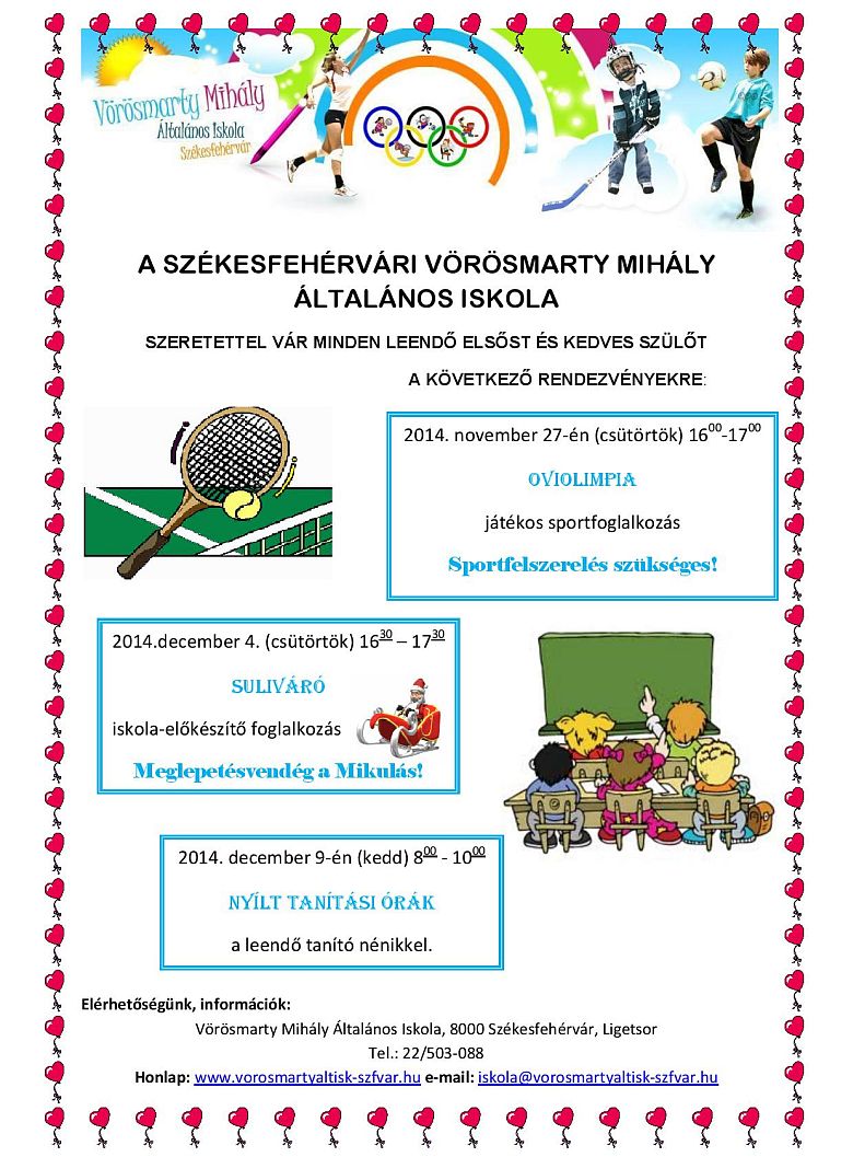 A Székes- fehérvári Vörösmarty Mihály Általános Iskola november 27-én, csütörtökön tartja nagyszabású, hagyományos sportversenyét, az Oviolimpiát. Ezt követően a leendő elsősöknek és szüleiknek lehetőségük van megismerkedni az iskolával: december 4-én, csütörtökön 16.30-tól Suliváró foglalkozást tartanak meglepetésvendéggel, majd december 9-én, kedden 8 és 10 óra között Nyílt Napra várják szeretettel az érdeklődőket.