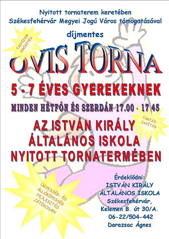 A Nyitott Tornatermek keretében az Isván Király Általános Iskolában 5-7 évesek számára szerveznek foglalkozásokat. A gyerekeket minden hétfőn és szerdán 17.00 órától várják a Kelemen Béla úti intézményben, ahol ügyességi és állóképeség-fejlesztő játékos gyakorlatokat tanulhatnak. Érdeklődni a 22/504-442-es telefonszámon lehet.