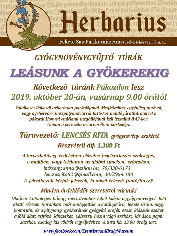 Leásunk a gyökerekig – nem véletlen a plakát hívószava, hiszen ebben a hónapban lehet kiásni a gyógynövények föld alatti részeit. A nyáron virágként szedett és említett katángkórónak, fekete ürömnek, nagy bojtorjánnak vagy pitypangnak most a gyökereit gyűjthetik be az érdeklődők a körülbelül 13 óráig tartó túrán. A gyűjtéshez célszerű kis ásót, vágószerszámot, papírzacskót, kisvödröt vinni, a program előtti kóstolóhoz pedig saját poharat.