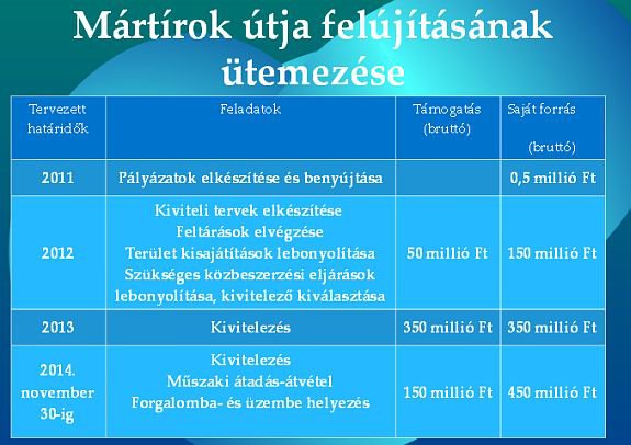 A Mártírok útja teljes felújításának becsült költsége 1,5 milliárd forint, amihez a két pályázaton összesen maximum 550 millió forint nyerhető el, ami a beruházás egyharmadát jelenti. A fennmaradó jelentős költségeket Székesfehérvár Önkormányzatának kell előteremtenie.