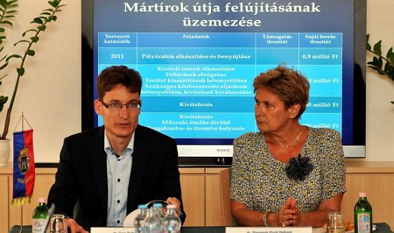 A Közgyűlés már döntött arról, hogy két pályázaton is elindul a város a Mártírok útjának teljes felújításáért. A szennyvízcsatorna építési munkálatok után így teljes szélességében és szerkezeti elemeiben is megújulhat a forgalmas útszakasz. A Mártírok útja felújításáról és a munkálatok ütemezéséről dr. Cser-Palkovics András polgármester és Dienesné Fluck Györgyi sajtótájékoztatón számolt be.