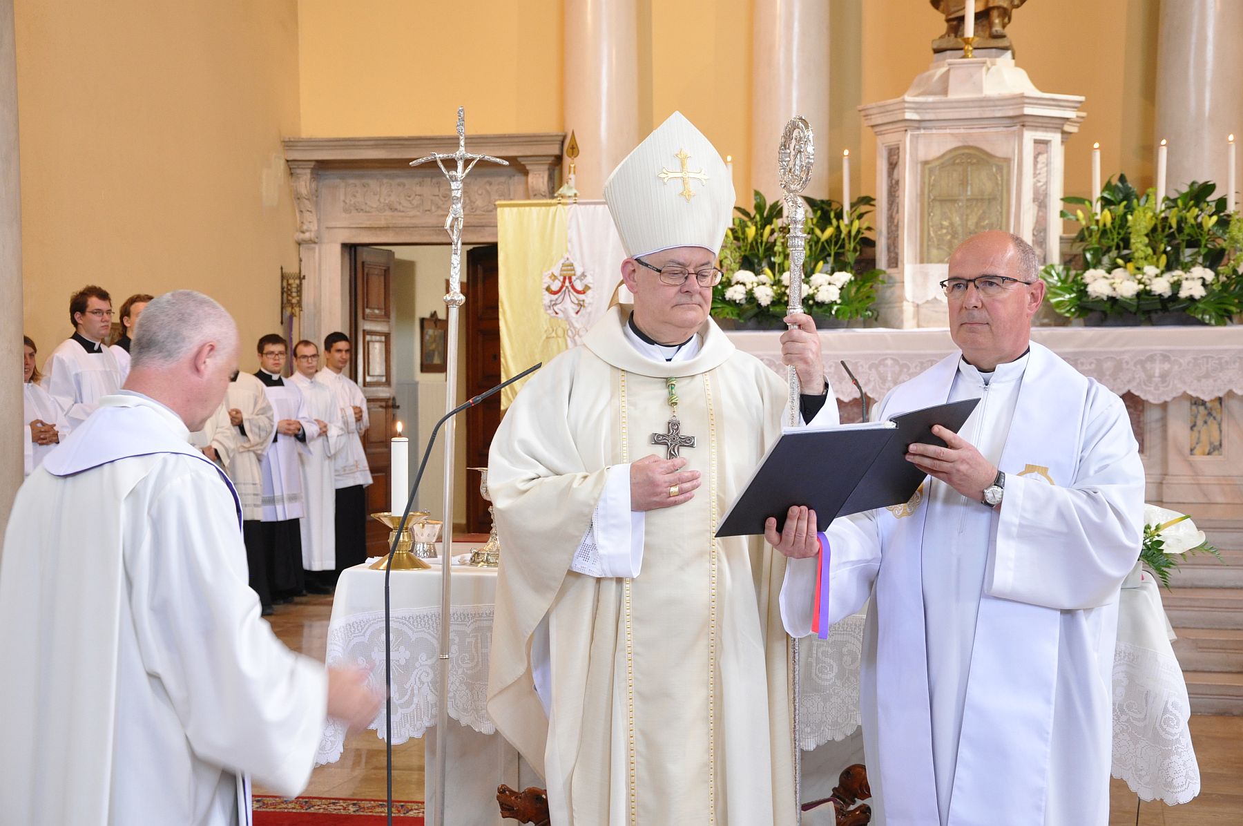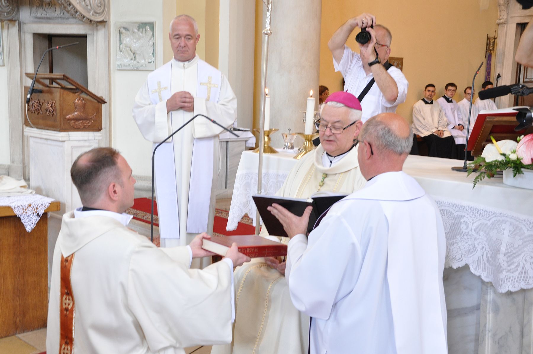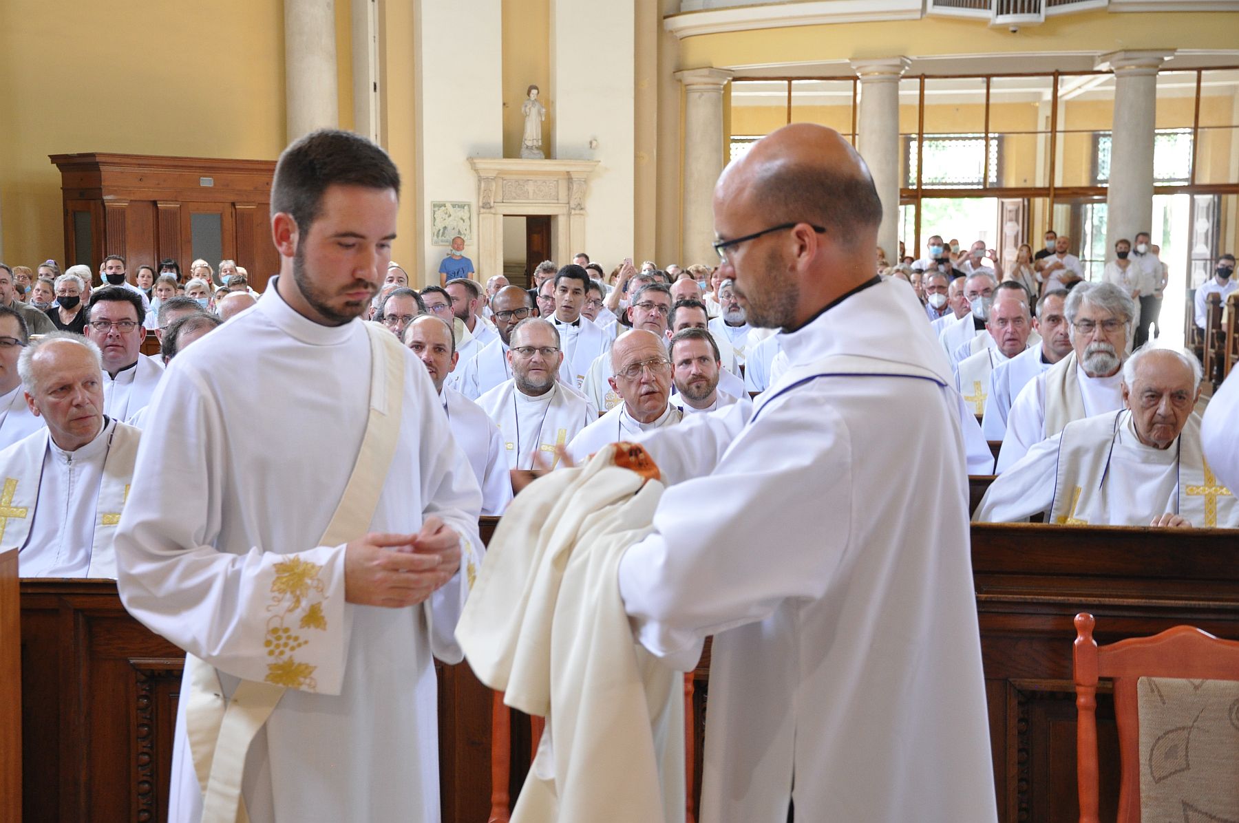 Az imádság után a paptársak liturgikus öltözékbe öltöztetették a felszentelteket, és ünnepélyesen átadták az evangéliumos könyvet.
