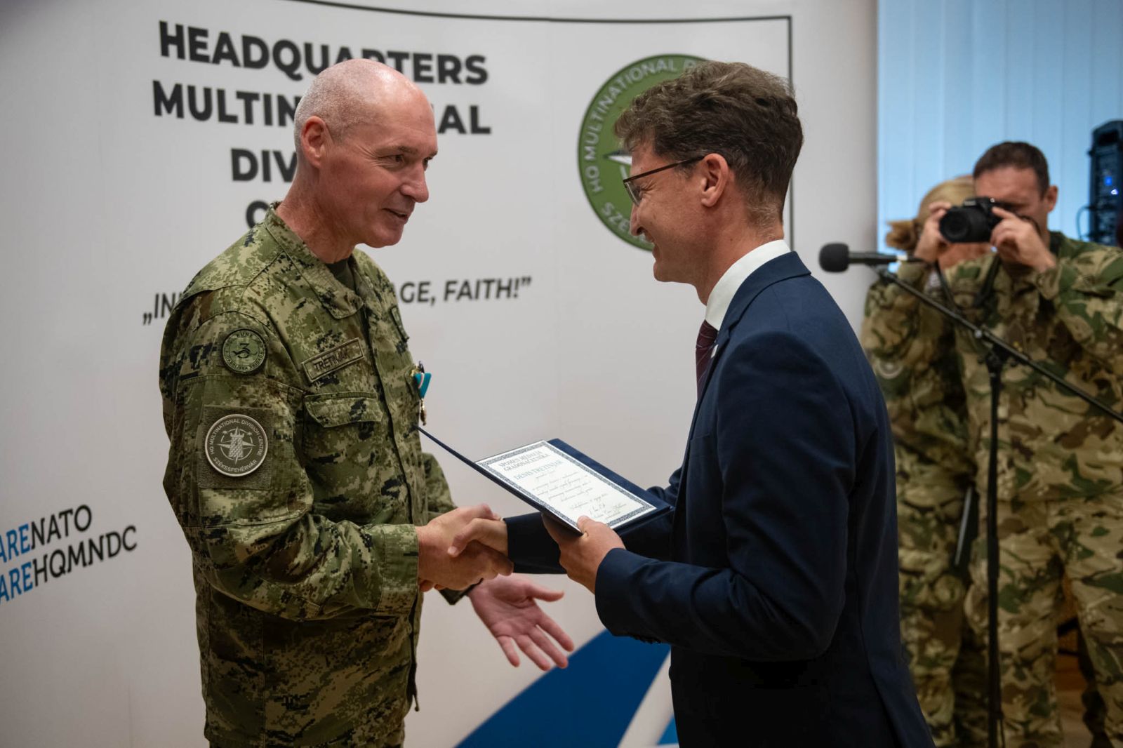 Az ünnepség keretében adták át a honvédelmi miniszter és a Honvéd Vezérkar főnöke által adományozott „Szövetségért Érdemjel” elismerést a távozó Denis Tretinjak vezérőrnagynak.