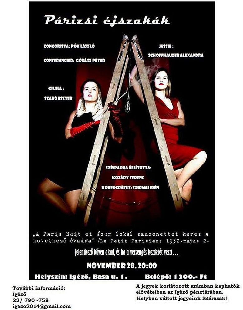 Élőzenés bemutatóra készülnek a székesfehérvári Igézőben (Basa utca 1.). 2014. november 28-án, pénteken este 20 órakor tartják a Párizsi éjszakák című sanzonest premierjét. A darabban, melyet Kozáry Ferenc állított színpadra, Szabó Eszter, Schoffhauzer Alexandra és Górász Péter szerepelnek. Jegyek még korlátozott számban kaphatók elővételben az Igéző pénztárában. A szervezők a műsorváltoztatás jogát fenntartják.