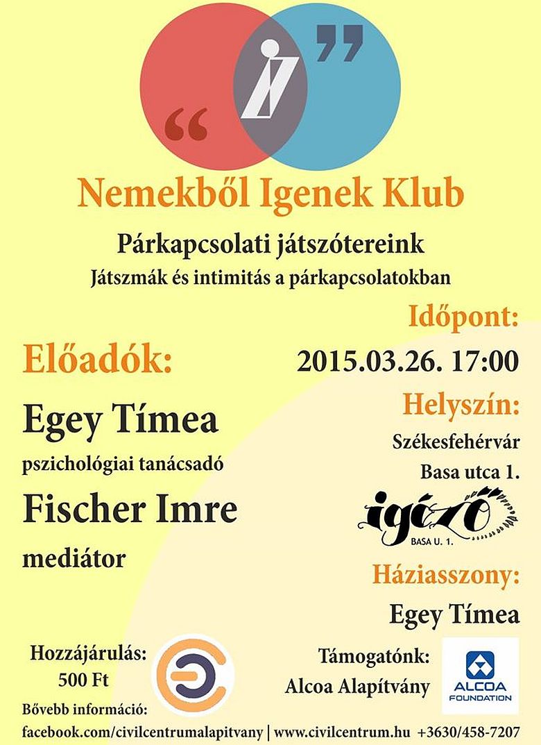A Civil Centrum Közhasznú Alapítvány Nemekből Igenek Klubjának újabb programját tartják március 26-án, csütörtökön délután 17 órától az Igézőben. A "Párkapcsolati játszótereink - Játszmák és intimitás a párkapcsolatokban" címmel megszervezett eseményen szó lesz arról, mit jelent az, hogy játszma, kik és miért játszmáznak a párkapcsolatokban, hogy lehet a játszmák kialakulását megelőzni, ha már létrejöttek, hogy lehet ezt kezelni és hathat-e, ha igen akkor miként a párkapcsolat minősége a munkavállalásra?