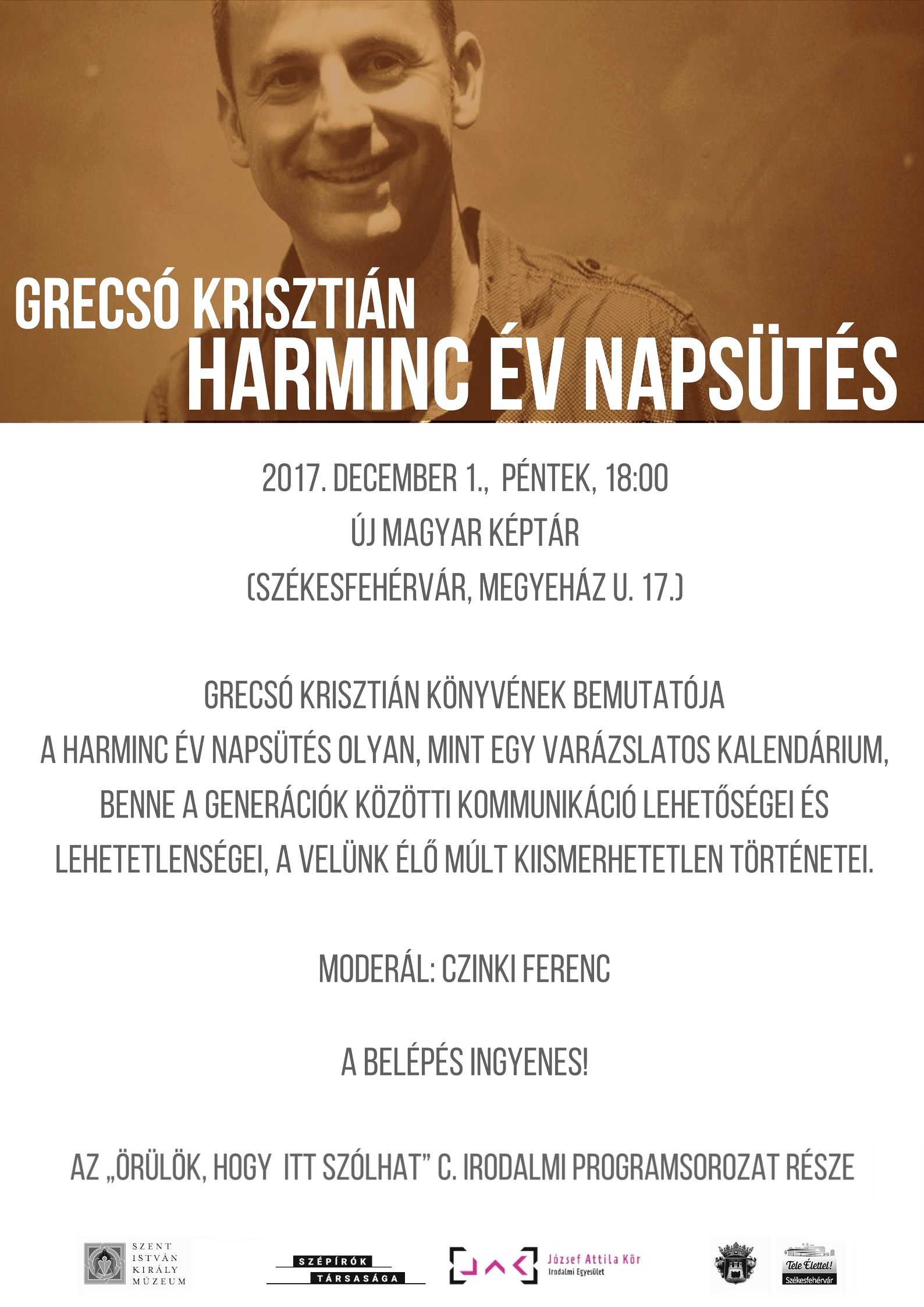 December 1-jén, pénteken 18 órakor Grecsó Krisztián legújabb kötetét, a Harminc év napsütést mutatják be az Új Magyar képtárban. A történetek személyes emlékeket idéznek föl, ismeretlenül is ismerősnek tűnnek Juszti mamával, a faluval, a nagyvárossal, és a generációk komikus és egyben drámai kalendáriumát adják. Ahogy egy kritikában olvasóható: „Grecsóban az a jó, hogy együtt öregszik velünk és megírja helyettünk az életünk fontos pillanatait.” A rendezvény moderátora Czinki Ferenc író lesz.
