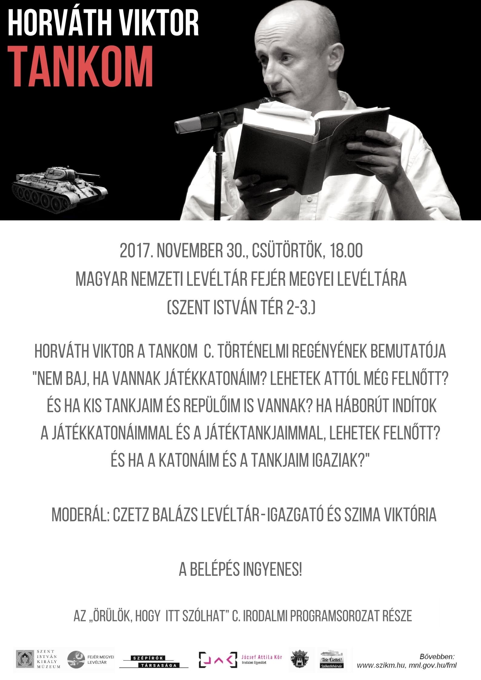November 30-án, csütörtökön 17 órakor Csóka Judit Gyógyító mesék című kötetét ismerhetik meg az érdeklődők a VMK Széna téri Tagkönyvtárában, az est vendégei Boldizsár Ildikó mesekutató és Király Levente, a Corvina Kiadó szerkesztője lesznek. A Székesfehérváron élő szerző klinikai szakpszichológust éppen Boldizsár Ildikó munkássága motiválta, hogy a meseterápiával foglalkozzon. Szintén csütörtökön 18 órakor a Fejér Megyei Levéltárban is könyvbemutató kezdődik: Horváth Viktorral a Tankom című kötetről Czinki Ferenc beszélget. A történelmi regény Csehszlovákia 1968-as lerohanásáról szól: főszereplője egy katonatiszt, aki politikai tolmácsként akaratlanul is az események alakítója lesz.