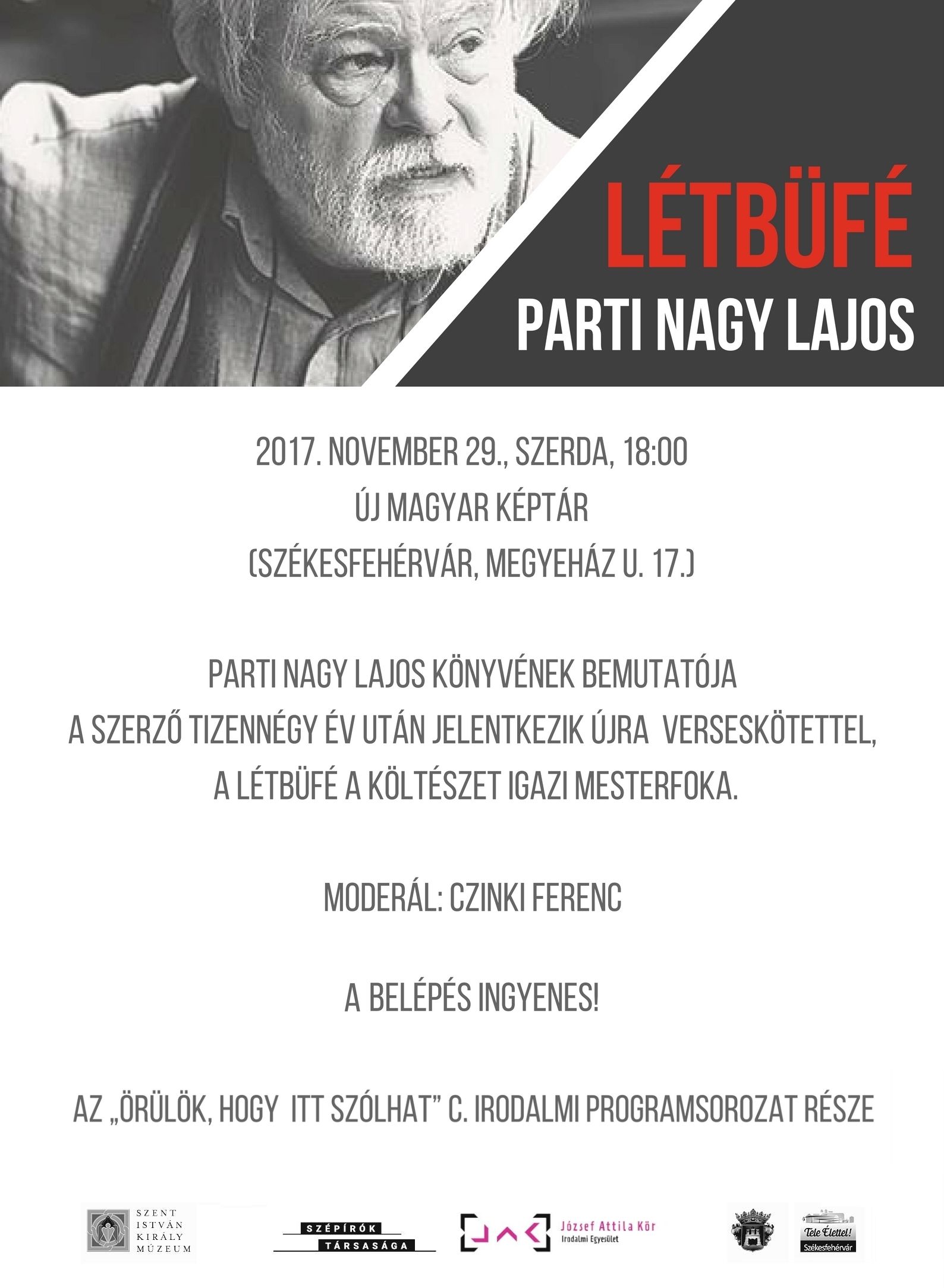 November 29-én, szerdán este 18 órakor Parti Nagy Lajos Létbüfé című kötetét mutatják be az Új Magyar Képtárban, a szerzővel Czinki Ferenc író beszélget. A napjaink egyik legzseniálisabb nyelvművészeként számon tartott alkotó tizennégy év után jelentkezett újra verseskötettel.