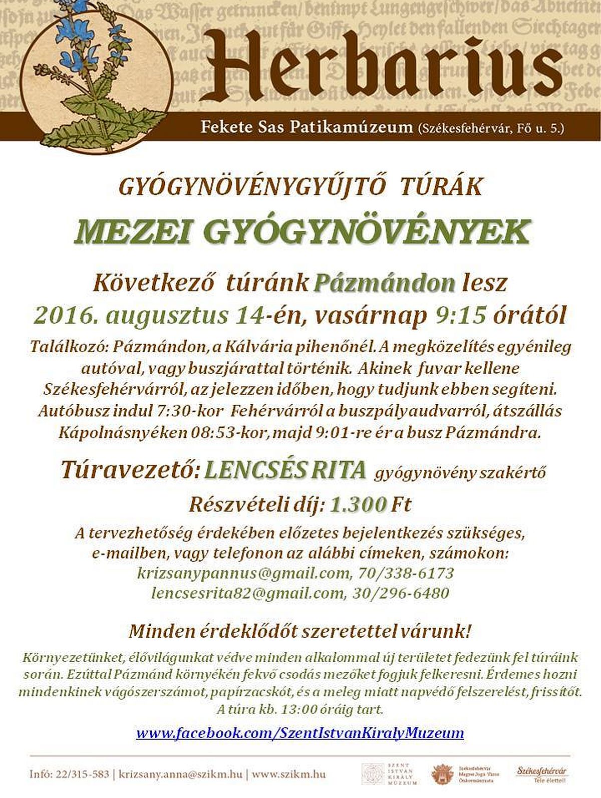 A Fejér megye közepén, a Velencei-hegység keleti nyúlványai alatt fekvő Pázmándra indul augusztus 14-én, vasárnap 9.15 órakor a következő Herbarius gyógynövénygyűjtő túra. „A nyárvégi kiránduláson még mindenki kiegészítheti házipatika-készletét a valódi ’zöld antibiotikumként’ számon tartott apróbojtorjánnal, de újdonságként lehet már gyűjteni az aranyvesszőt vagy a mezei zsurlót, a katángkórót, az orbáncfüvet és a cickafarkat is.” – invitál a programra Lencsés Rita fitoterápiás végzettségű szakember. A túrára ajánlott vágószerszámmal és papírzacskóval érkezni, valamint javasolt a napvédő felszerelés és a frissítő.