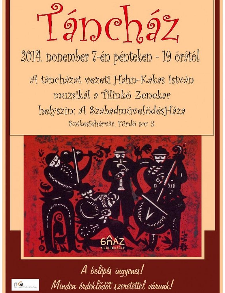 2014. november 7-én, pénteken este újabb Táncházat szerveznek A Szabadművelődés Házában (Székesfehérvár, Fürdő sor 3.). A foglalkozást Hahn-Kakas István vezeti, a muzsikáról pedig a Tilinkó Zenekar gondoskodik majd. Az esemény pénteken este 19 órakor kezdődik, amelyre ingyenes belépést biztosítanak a szervezők. A programra szeretettel várnak minden kedves érdeklődőt.