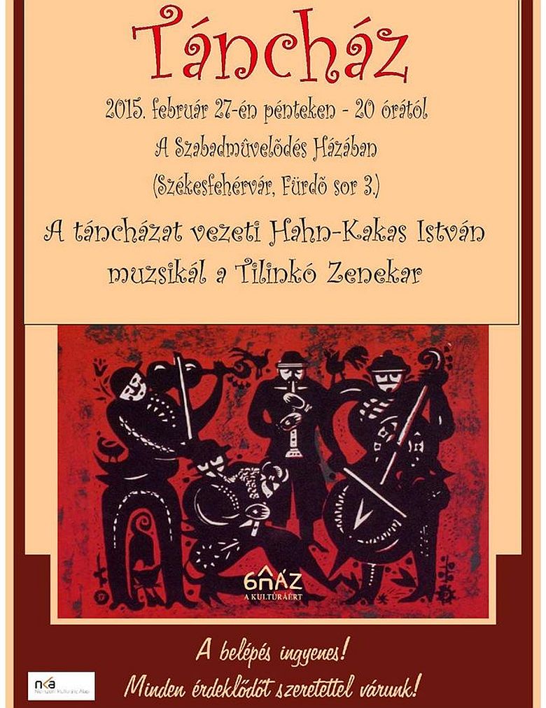 2015. február 27-én, pénteken este újabb Táncházat szerveznek A Szabadművelődés Házában (Székesfehérvár, Fürdő sor 3.). A foglalkozást Hahn-Kakas István vezeti, a muzsikáról pedig a Tilinkó Zenekar gondoskodik majd. Az esemény pénteken este 20 órakor kezdődik, a programra sok szeretettel várnak minden kedves érdeklődőt a szervezők.