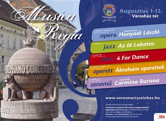 Erkel Ferenc Hunyadi László című operájának rövidített változatával indul az idei Musica Regia a Városház téren. A programsorozat kulturális és turisztikai szempontból is fontos Székesfehérvár életében -mondta dr. Csapó Csilla alpolgármester. Augusztus 5-én az "Öt Lakatos" jazzkoncertjével folytatódik a Musica Regia. A 4 For Dance kamaraegyüttes táncműsorával augusztus 6-án lép a színpadra, 8-án és 9-én Ábrahám Pál operettkomponista művei csendülnek fel, 11-én pedig az Alba Regia Szimfónikus zenekar 500 fős vegyeskarral játsza a Carmina Buranát.