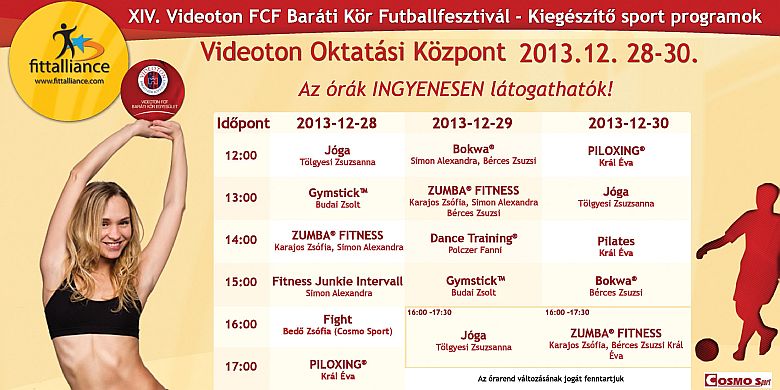 A labdarúgáson kívül azonban egyéb kiegészítő sport programokat is kipróbálhatnak az érdeklődők. December 28-án, 29-én és 30-án 12-17 óráig lehet részt venni a szakképzett oktatók közreműködésével megrendezett ingyenes foglalkozásokon. A mozogni vágyókat pilates, jóga, dance training, bokwa is várja, továbbá az egészséges életmód megőrzésének érdekében testösszetétel-mérést is végezhetnek a résztvevők. A felnőtteken kívül a gyerekek is aktívan tölthetik el az elkövetkezendő napokat, hiszen játéksarok, darts, pingpong is szerepel a programban.