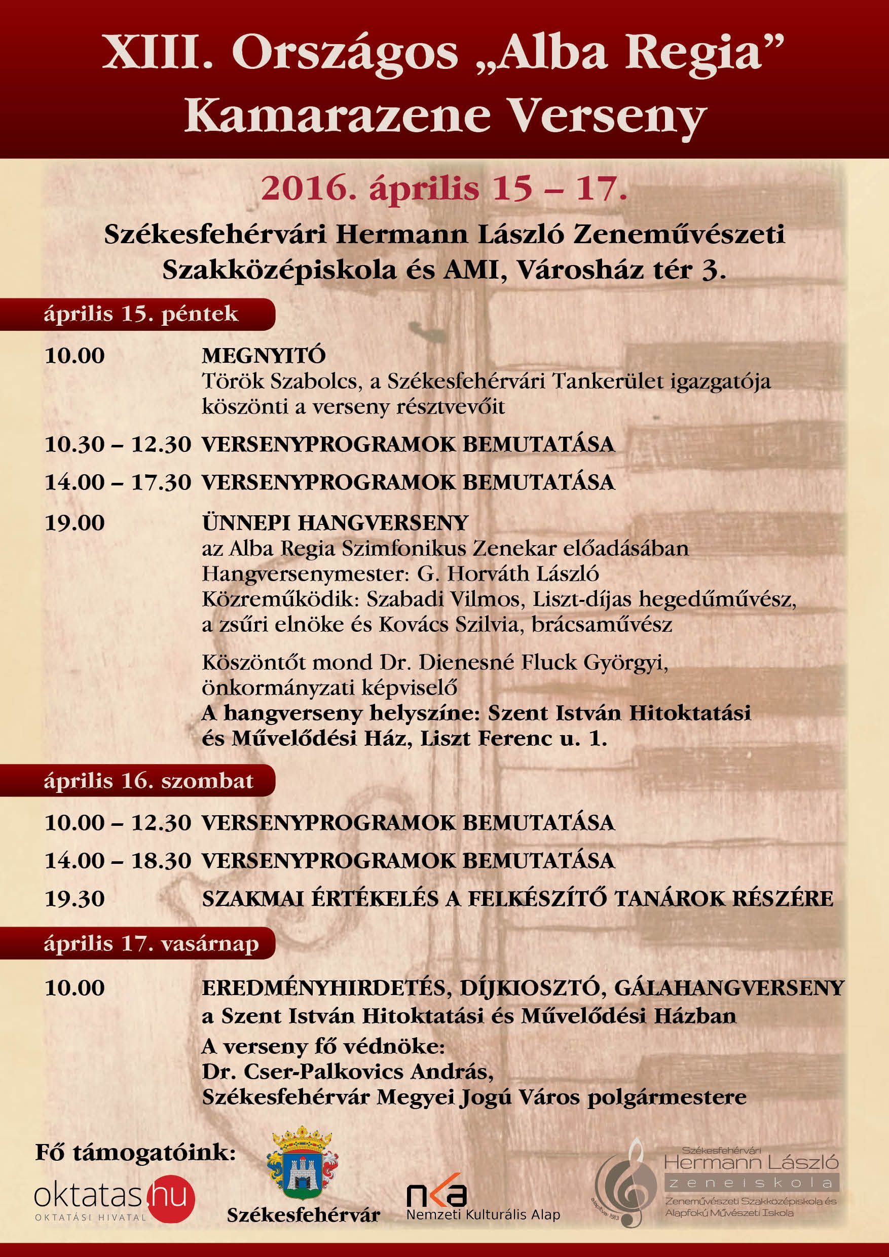 Az Országos "Alba Regia" Kamarazene Versenyt azzal a céllal hirdetik, hogy a fiatalokban fejlesszék a társas muzsikálási igényt, valamint hogy bemutatási lehetőséget kapjanak a kamarazene pedagógiai és előadói eredményei. Az országos gyakorlati versenyt immár 13. alkalommal a Székesfehérvári Hermann László Zeneművészeti Szakközépiskola és AMI rendezi. A rangos zenei találkozó megnyitóját április 15-én, pénteken 10 órakor tartják, amelyen köszöntő beszédet mond Török Szabolcs, a Székesfehérvári Tankerület igazgatója.