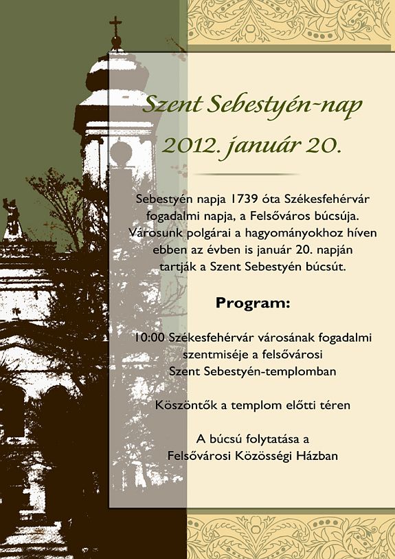 Székesfehérvár városának hagyományos fogadalmi miséje lesz pénteken a Szent Sebestyén templomban. Január 20. Szent Sebestyén napja fontos ünnep nemcsak Székesfehérvár életében: 1739-ben, a pestisjárvány idején a felsővárosiak böjtöt tartottak és körmeneteken kérték Szent Sebestyén közbenjárásával Istent, hogy menekítse meg őket. A fehérváriak szerencsésen megmenekültek és fogadalmuk részeként először kápolnát, majd templomot emeltek Szent Sebestyénnek.