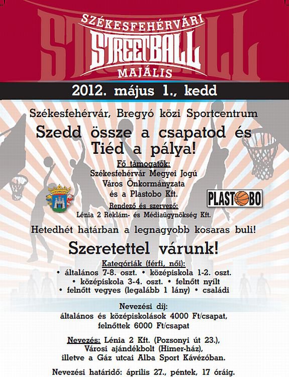 Mint már beszámoltunk róla, Székesfehérvár Önkormányzata és a Plastobo Kft. támogatásával jön létre ismét a megye legnagyobb streetball-találkozója, amelyre péntekig, április 27-ig lehet jelentkezni, ahogy a plakáton is látható a Lenia 2 Kft-nél a Pozsonyi úton, a Himer-házban található városi ajándékboltban illetve a Gáz utcai Alba Sport kávézóban. A pénteken 17 óráig beérkező csapatnevezéseket fogadják el a szervezők, akik a torna zökkenőmentes lebonyolítása érdekében kérik, hogy mindenki előzetesen jelentkezzen. Nevezési díj iskolásoknak 4000, felnőtteknek 6000 forint csapatonként. Információt a 22/340-840-es telefonszámon lehet kapni az eseményről.