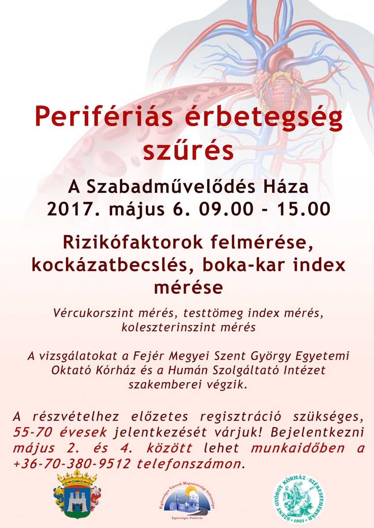 Ismét lesz perifériás érbetegség szűrés Székesfehérváron. Az ingyenes vizsgálatokat május 6-án, szombaton tartják A Szabadművelődés Házában. Elsősorban az 55-70 év közöttiek részvételét várják előzetes bejelentkezés alapján. Ismét lehetőség lesz a vércukorszint, a koleszterinszint és a testtömeg-index mérésére, várható továbbá kockázatbecslés és boka-kar index számítás.