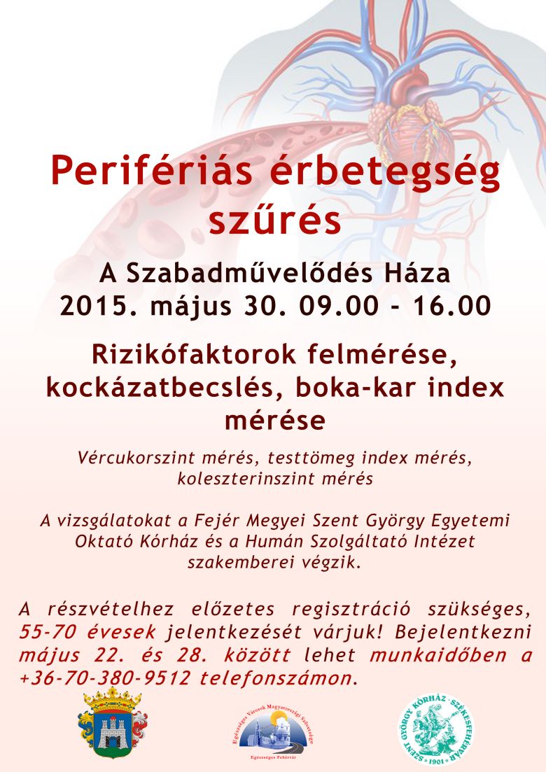 Május 30-án 9 órától 16 óráig perifériás érbetegség szűrésre várják a fehérváriakat A Szabadművelődés Házába, ahol felmérik a rizikófaktorokat, kockázatbecslést végeznek és boka-kar index mérésre is sor kerül. Az ingyenes vizsgálatokat a Fejér Megyei Szent György Egyetemi Kórház és a Humán Szolgáltató Intézet szakemberei végzik.