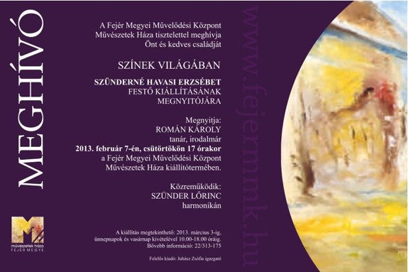 Juhász Zsófia, a Fejér Megyei Művelődési Központ - Művészetek Háza igazgatója elmondta, hogy kiállítással, népzenei koncerttel és filmvetítéssel is csatlakozik a Fejér Megyei Művelődési Központ-Művészetek Háza a Kultúrházak éjjel-nappal című országos közművelődési akcióhoz. Február 7-én csütörtökön 17 órától a Művészetek Háza kiállítótermében nyílik meg Szünderné Havasi Erzsébet festő kiállítása. A tárlatot, amely március 3-ig tekinthető meg, Román Károly tanár, irodalmár nyitja meg.