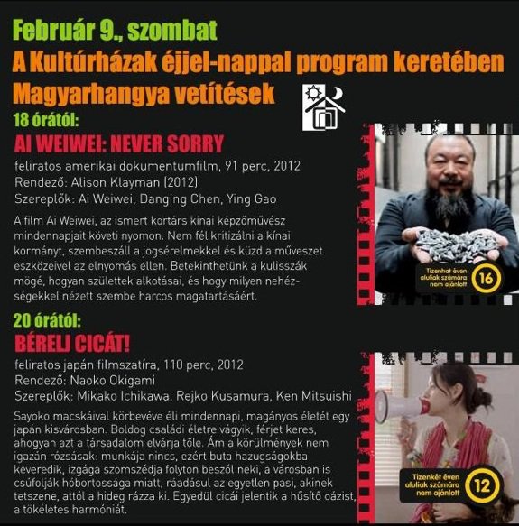 Február 9-én szombaton amerikai dokumentumfilmet vetítenek a Barátság Moziban a Kultúrházak éjjel-nappal program keretében. A film Ai Weiwei, az ismert kortárs kínai képzőművész mindennapjait követi nyomon. Ai Weiwei építész, szobrász, fényképész, konceptuális alkotó, emberijogi aktivista blogger és óriási twitterező, aki nem fél kritizálni a kínai kormányt, szembeszáll a jogsérelmekkel és küzd a műveszet eszközeivel az elnyomás ellen.