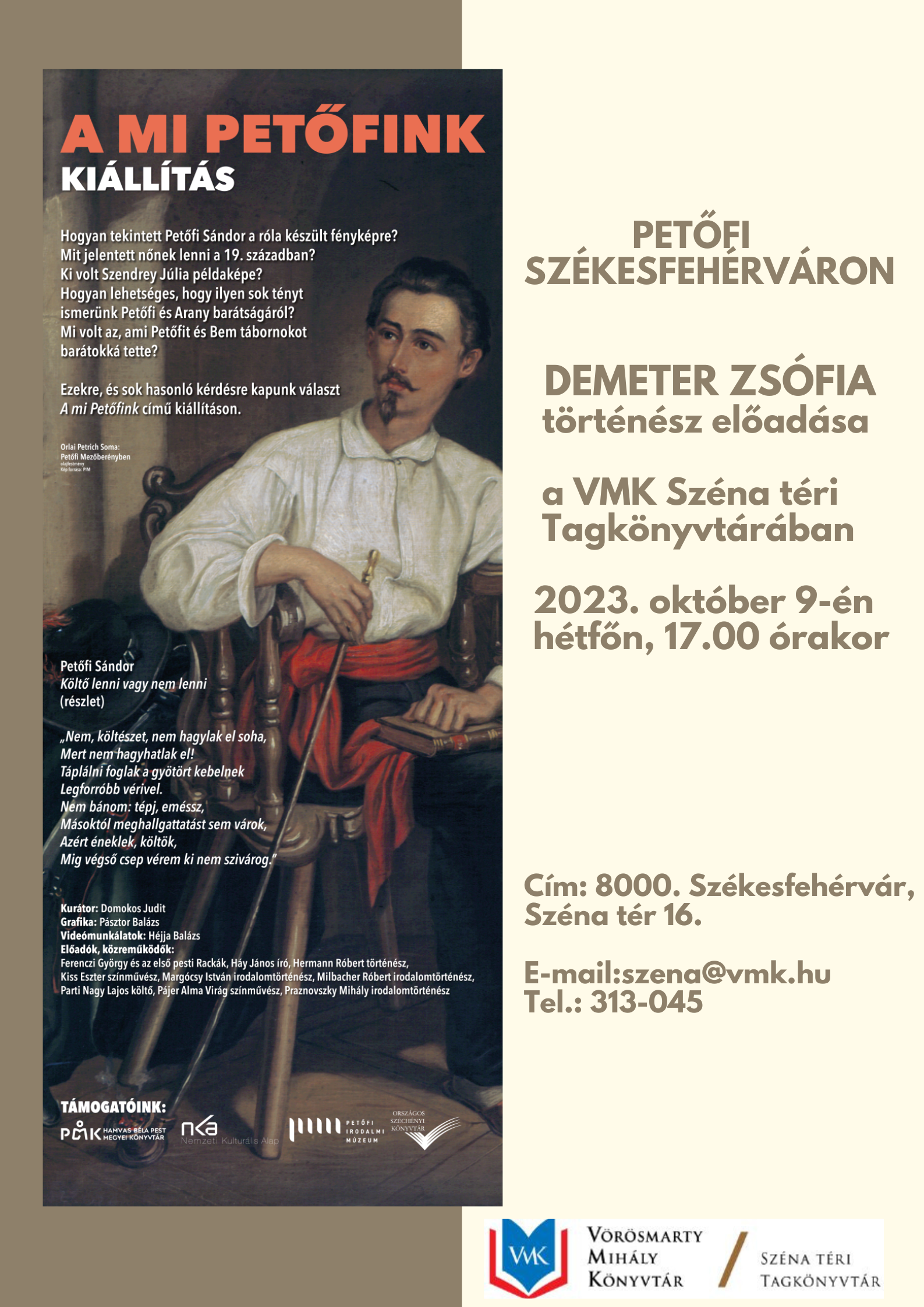 Október 9-én, hétfőn 17.00 órától a Vörösmarty Mihály Könyvtár Széna téri Tagkönyvtárában Petőfi Székesfehérváron címmel tartanak előadást, egyben megnyitják a Mi Petőfink című kiállítást.