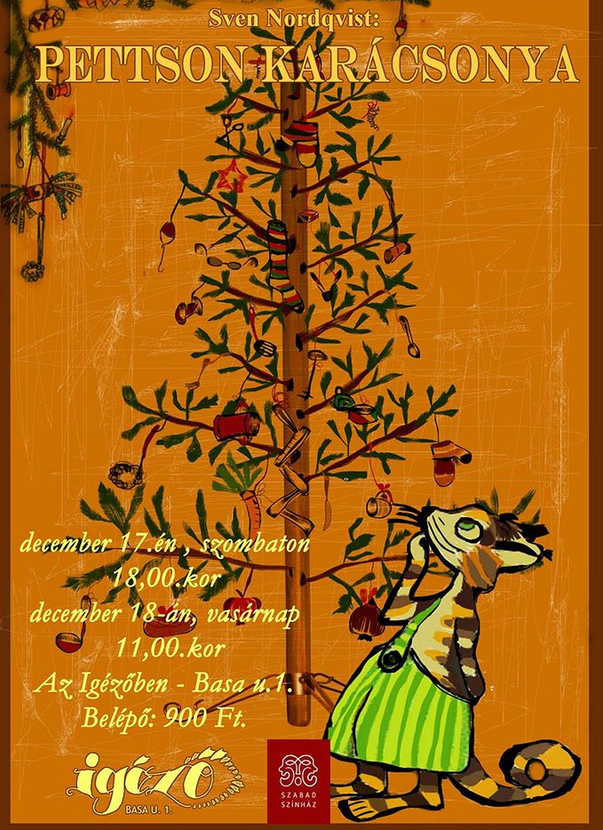 Múlt csütörtökön ismét megérkezett az öreg Pettson és igaz barátja Findusz macska az Igézőbe, ahol egy jótékonysági előadáson örvendeztették meg a kicsiket és a nagyokat. Advent utolsó hétvégéjén újra találkozhatnak velük és Sven Nordqvist népszerű történetével az érdeklődők! Végre megenyhült az idő, Pettson pedig immár nyugodtan készülhet a karácsonyra kandúrjával: kivághatják a fenyőfát, elmehetnek bevásárolni és megsüthetik kedvenc mézesüket. Ám mindehhez először el kell takarítaniuk a havat az udvarról, sőt az öreg még néhány gallyat is tenni szeretne a lépcsőre. El is indulnak, hogy gyűjtsenek egy nagy rakásra valót az erdőben, de Pettsont ekkor hirtelen olyan rémes baleset éri, hogy alig bírj a megmozdítani a lábát. Lehet, hogy semmi nem lesz az ünneplésből?