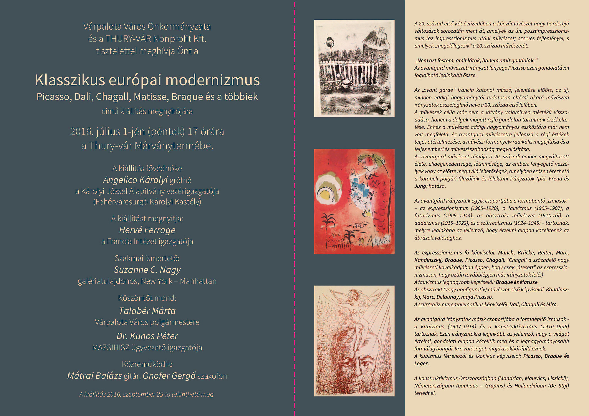 Klasszikus európai modernizmus: Picasso, Dali, Matisse, Braque és a többiek címmel a New York-i Csikós Nagy Zsuzsanna gyűjteményéből nyílik kiállítás július 1-jén a várpalotai Thury-Várban. A tárlaton az európai modern festészet legnagyobb művészeinek 27 alkotása látható. Az egyedi rézkarcok és litográfiák az expresszionizmus, kubizmus, futurizmus és szürrealizmus világába vezetik be a látogatókat.