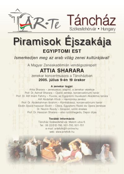 Az arab világ zenei kultúrájával ismerkedhetünk július 9-én szombaton este 7 órakor a Táncházban. A Piramisok Éjszakája című egyiptomi esten a Magyar Zeneakadémián vendégszerepelt Attia Sharara zenekara várja a székesfehérváriakat.