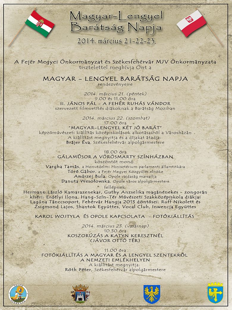Róth Péter, Székesfehérvár alpolgármestere arra hívta fel a figyelmet, hogy a Polgármesteri Hivatal Közművelődési és Rendezvényszervező Irodáján lehet még jegyet igényelni a szombati, színházi gálaműsorra a 22-537-110-es telefonszámon. Mint mondta a két nép közös történelmére is felhívják a programok a figyelmet: a viharos XX. század mind a magyar, mind pedig a lengyel népet sújtotta. Vasárnap délelőtt 10.30-kor a Jávor Ottó téren, a Katyn emlékkeresztnél koszorúznak és emlékeznek a lengyelek II. világháborús tragédiájára. A Nemzeti Emlékhelynél pedig a két nép közös szentjeit is megismerhetik az érdeklődők, a vasárnap 11.00-kor megnyíló kiállításon. A két nép szentjei fontos szerepet töltöttek be egykor egész Európában és érdekesség, hogy II. János Pált, áprilisban Rómában avatják majd szentté.