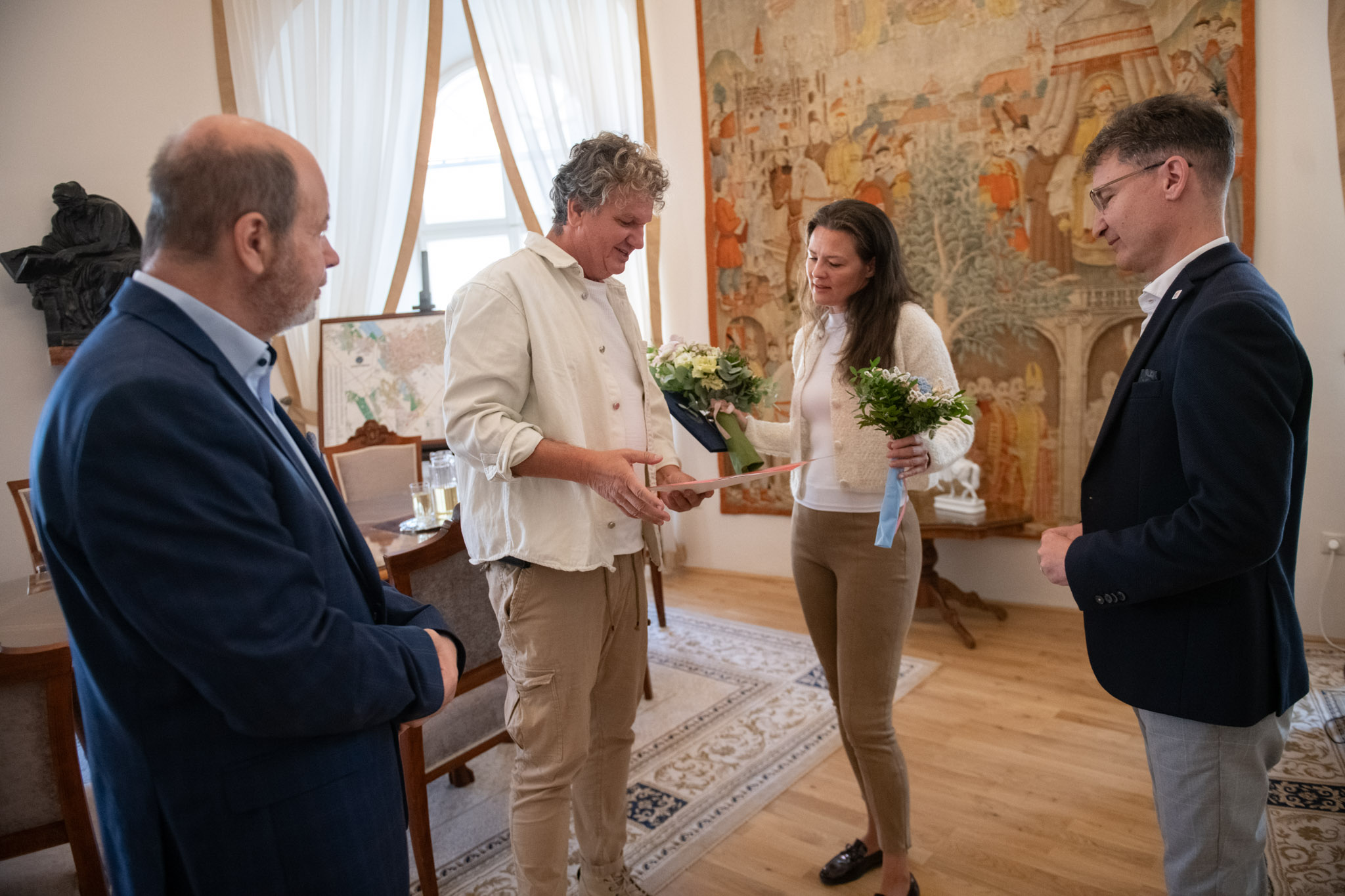 A polgármester a város közössége nevében köszöntötte a címert ábrázoló ezüstéremmel és a Vörösmarty Színházat ábrázoló oklevéllel a színművészt, aki tizenegy éven át volt a színház társulatának tagja.