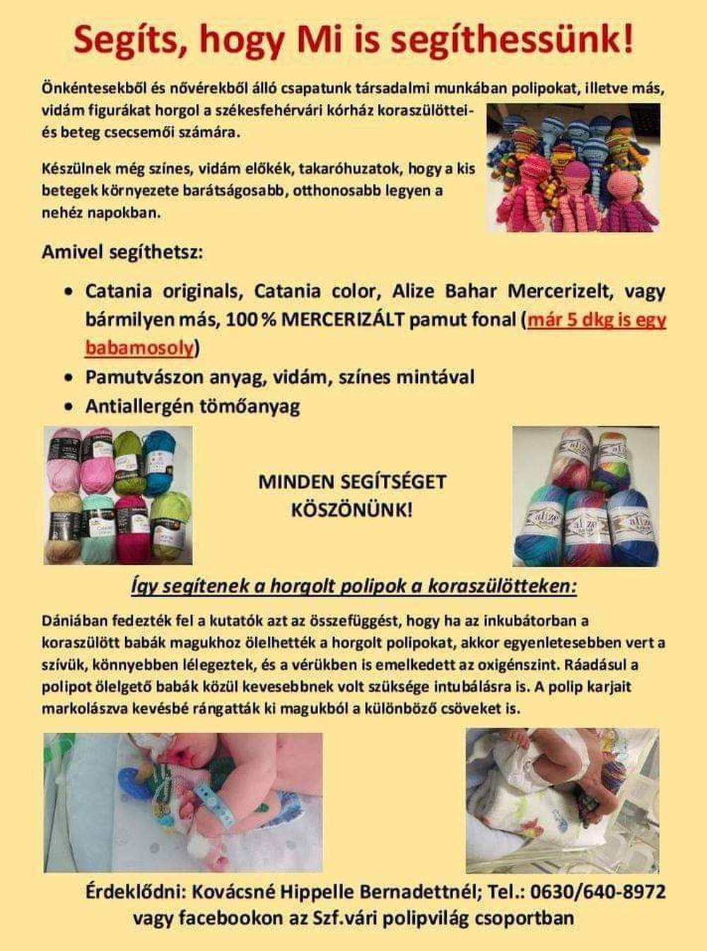 A székesfehérvári polipvilág egy kilenc éve működő önkéntes csapat. A fehérvári kórház koraszülötteinek, beteg babáinak és gyermekeinek horgolnak polipkákat, különböző figurákat, amelyeket kis tulajdonosaik haza is vihetnek magukkal.