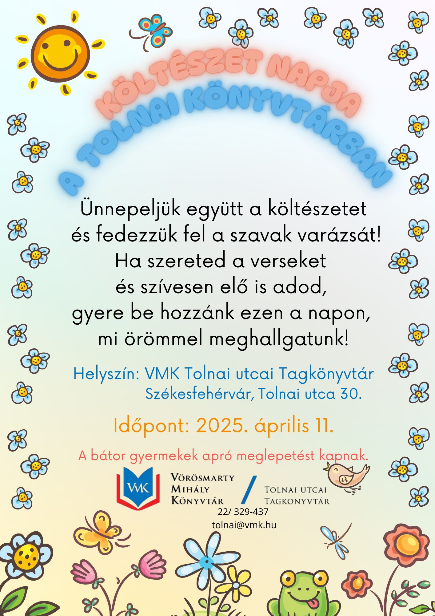 A közös ünneplés jegyében, a VMK Tolnai utcai Tagkönyvtárában az olvasókkal együtt szeretnék felfedezni a szavak varázsát. Arra kérik őket, hogy menjenek be az intézménybe pénteken és szavaljanak el egy választott költeményt, melyet örömmel meghallgatnak. A bátor gyermekeket apró meglepetésekkel jutalmazzák.