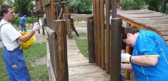 A Szivárvány Óvoda kerti gyermekjátékainak felújítását végezték el a székesfehérvári Praktiker Áruház dolgozói pénteken. A játékokat az áruház dolgozói a szülői munkaközösség képviselőivel közösen festették újra gyermek- és környezetbarát festékekkel. A közösség a munkát hiába kezdte el már korán reggel a délutáni felhőszakadás közbeszólt, így a munka esőmentes időben folytatódni fog.