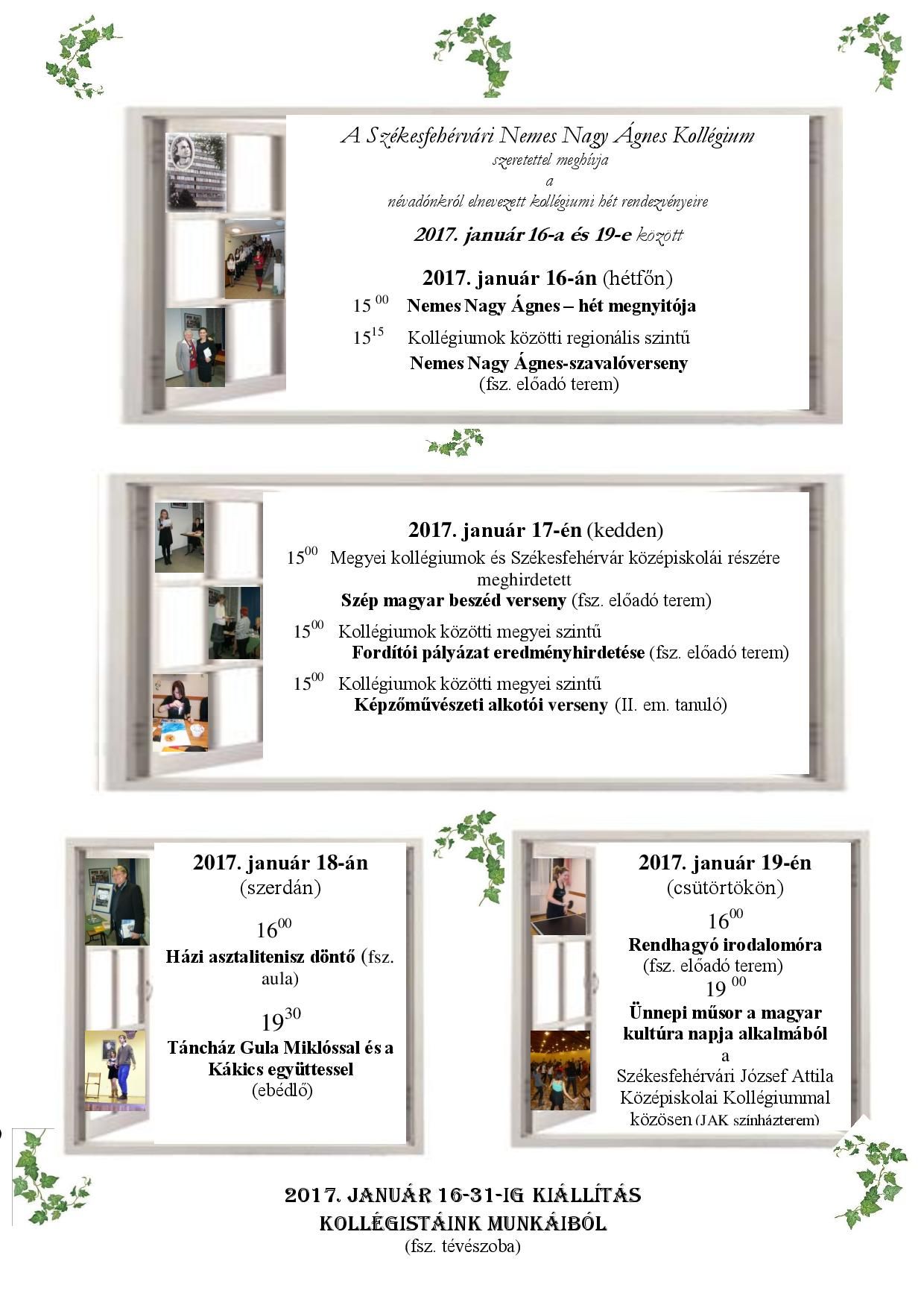 Január 18-án, szerdán délután asztalitenisz versennyel folytatódik a program, majd este táncházat szerveznek Gula Miklós és a Kákics együttes közreműködésével. 19-én, csütörtökön zárul a hét programsorozata rendhagyó irodalomórával és a Magyar Kultúra Napja alkalmából szervezett ünnepi műsorral, melyet a Székesfehérvári József Attila Középiskolai Kollégiummal közösen szerveznek. A hét programjait színesíti a Nemes Nagy Ágnes kollégisták munkáiból rendezett alkotói kiállítás, melyet mától január végéig lehet megtekinteni.
