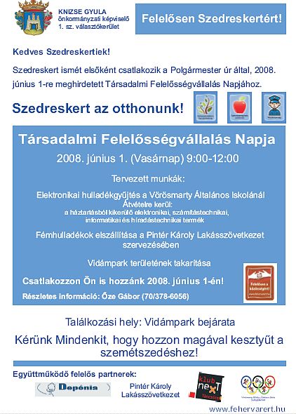 A vasárnapi Társadalmi Felelősségvállalás Napjához a Szedreskert lakóközössége is csatlakozott: elektronikai hulladékgyűjtést tartanak a körzetben, a Vidámparkban takarítanak majd a lakók, illetve a körzet legnagyobb lakásszövetkezete fémgyűjtést is szervez. A Szedreskert és környékének lakóközössége elsőként csatlakozott a naphoz, mely szintén része a "Felelősen a közösségért! Felelősen Fehérvárért!" programnak. PLAKÁT A CIKKBEN!