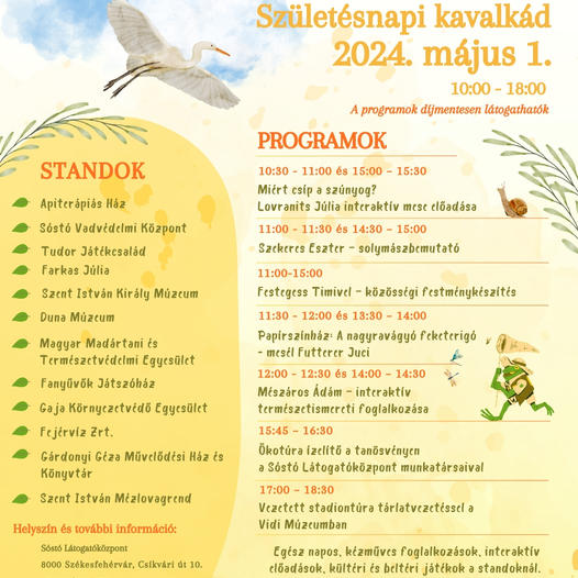 Az ötéves Látogatóközpont délelőtt 10:00-től estig várja a vendégeket: Lovranits Júlia ’Miért csíp a szúnyog?’ interaktív mese előadása (10:30 és 15:00) és Szekeres Eszter solymászbemutatója (11:00 és 14:30) több alkalommal szórakoztatja a gyerekeket a nap folyamán, a közösségi festménykészítés élményébe pedig 11 és 15 óra között nyerhetnek betekintést az érdeklődők Sturcz Tímeával és csapatával. A Gárdonyi Géza Művelődési Ház és Könyvtár munkatársa, Futterer Juci papírszínháza ’A nagyravágyó feketerigó’-val szintén két alkalommal (11:30 és 13:30) köti le a gyerekeket, ahogy Mészáros Ádám interaktív természetismereti foglalkozása is (12:00 és 14:00). A színes programokat egy igazán ünnepi esemény is tarkítja a délelőtt folyamán. Az április végén lezárult és közel félszáz pályamunkát felölelő „Sóstón jártam, Sóstón láttam” című rajzpályázat eredményhirdetésével és díjkiosztójával (11:15). A gyermekrajzokat május 5-ig tekinthetik meg a Látogatóközpontba érkezők.