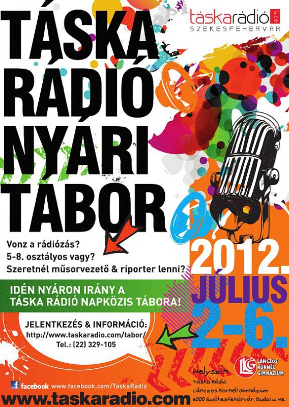 Napközis tábort szervez 5-8. osztályos diákoknak a Táska Rádió. Olyan fiatalok jelentkezését várják, akiket vonz a rádiózás, műsorvezetés, riporteri, illetve technikusi munka és a szerkesztés. A tábor a Lánczos Kornél Gimnázium lesz, a Budai út 43-as szám alatt, ahol a rádió stúdiója is található.