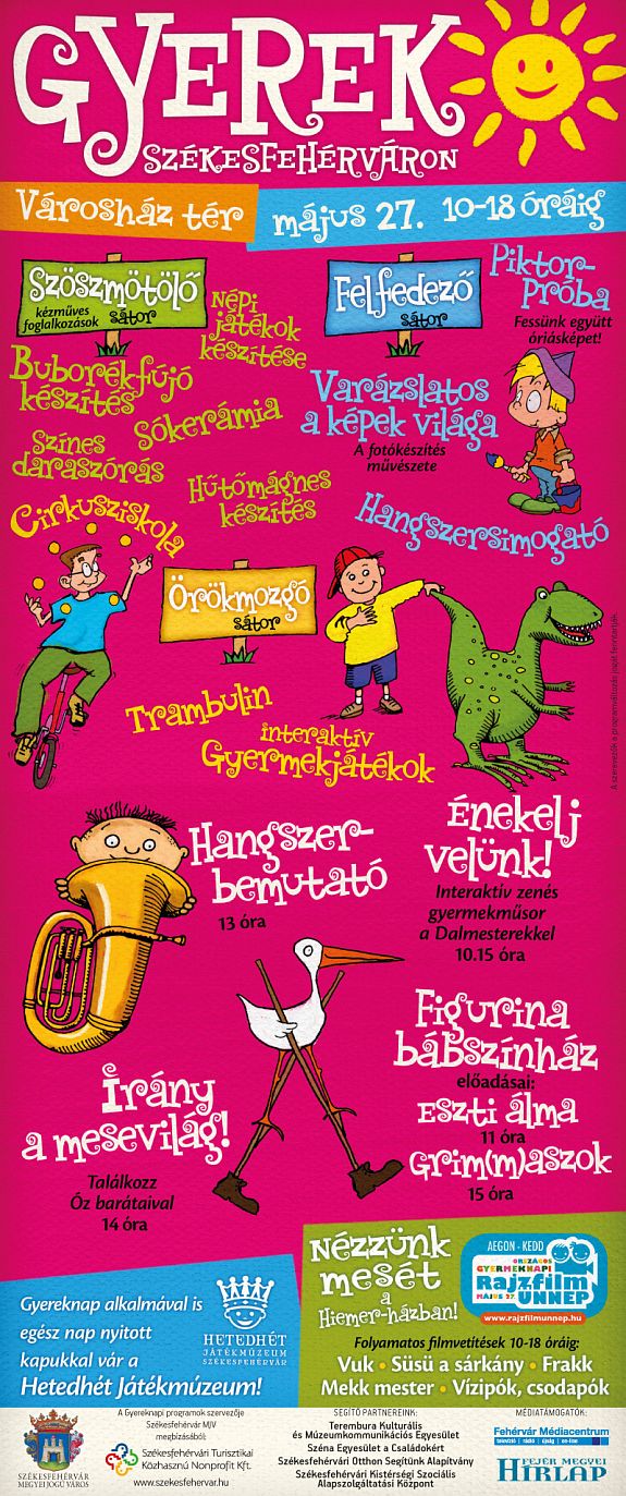 Ahogy minden évben, idén is közös ünneplésre hívja a gyerekeket Székesfehérvár Önkormányzata május 27-én. Idén a Városház-tér ad otthont a programoknak, amit szó szerint otthonossá szeretnének tenni a szervezők. A tér már napokkal korábban virágdíszbe öltözik a május 25-én kezdődő Virágálom Pünkösdkor rendezvény keretében, idén kifejezetten a gyerekek örömére vidám figurákkal, kompozíciókkal. Május 27-én a Hiemer-ház gótikus termében délelőtt 10 órától este 6-ig mesemaraton lesz.