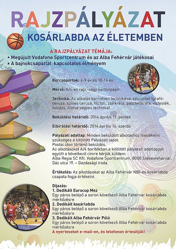 A kosárlabdával és az Alba Fehérvárral kapcsolatos élményeiket rajzolhatják meg azok a gyerekek, akik részt vesznek a bajnoki címvédő klub által kiírt rajzpályázaton. Bármilyen technikával készíthetnek műveket, a csapat játékosai bírálják majd el a beérkező alkotásokat. Április 11-ig várják a rajzokat a gyerekektől, a legjobb pályamű alkotója dedikált csapatmezt kap, de egyéb nyeremények is vannak.