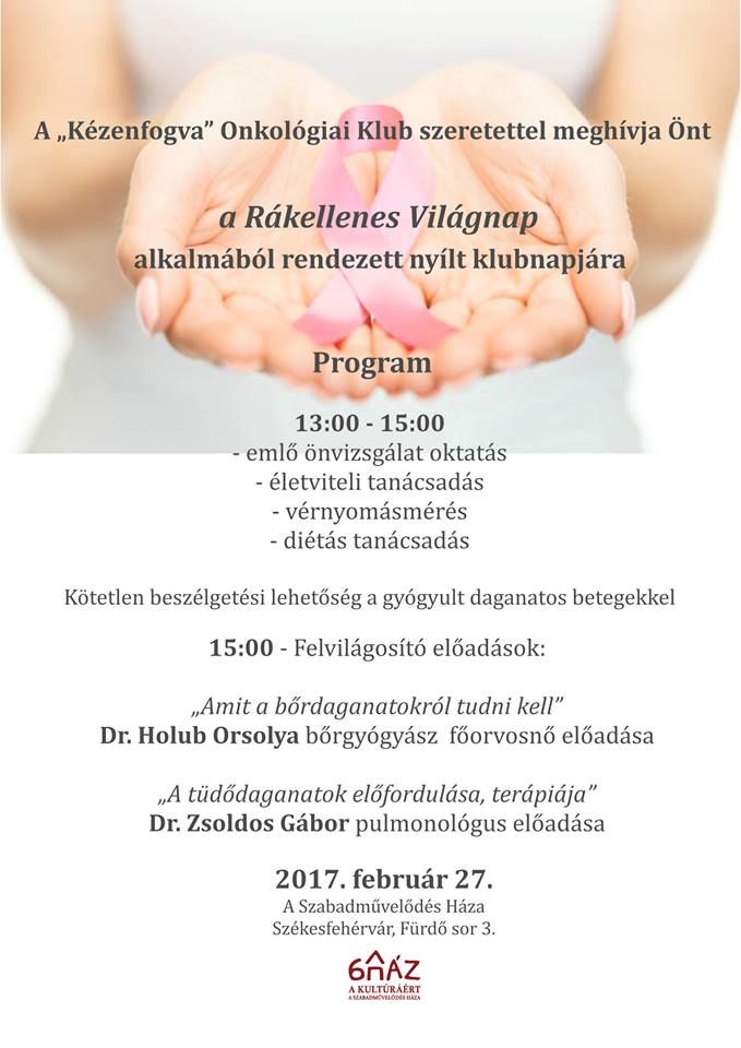 Február 27-én 13 órától a Rákellenes Világnap alkamából a Kézenfogva Onkológiai Klub programjai zajlanak A Szabadművelődés Házában, ahol többek között felvilágosító előadásokon vehetnek részt az érdeklődők, valamint lesz életviteli és diétás tanácsadás is.előadást tart Holub Orsolya bőrgyógyász főorvos és Zsoldos Gábor pulmonológus.