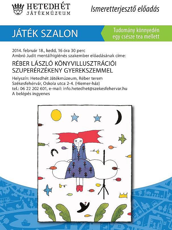 „Réber László könyvillusztrációi szuperérzékeny gyerekszemmel" címet viseli Ambró Judit mentálhigiénés szakember előadása, amelyet kedden 16.30 órakor tart a Hetedhét Játékmúzeumban. A belépés díjtalan, minden érdeklődőt a polgári szalonok teadélutáni hangulatával várnak február 18-án, kedden 16.30 órakor a Hetedhét Játékmúzeum Réber-termében.