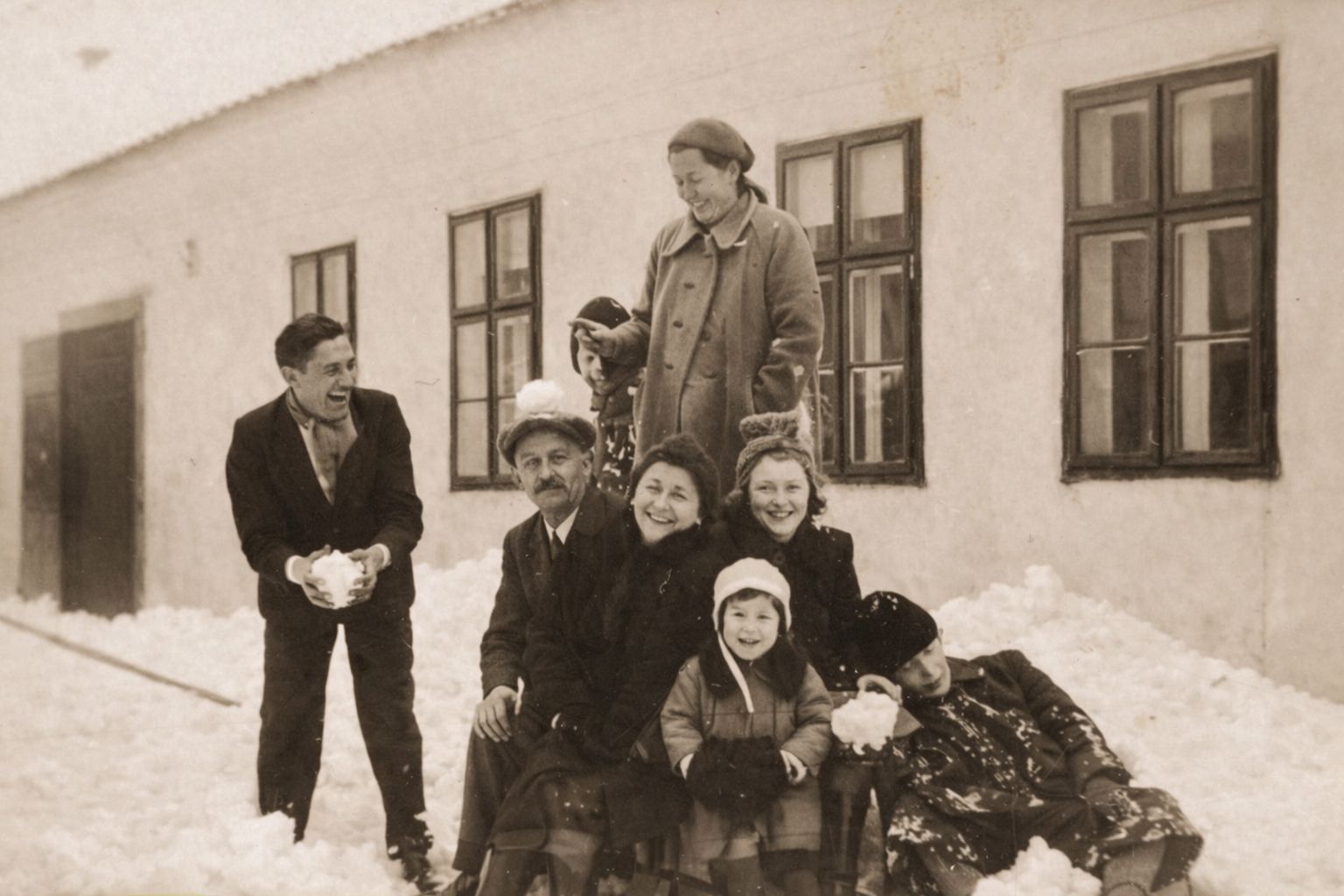 Hógolyózás, 1940 körül. Az interneten található családi fényképek között böngészve is felfedezhetünk néhány téli jelenetet. A Németh család az egykorvolt Boldogasszony téren, a Palotaváros hetvenes években felszámolt részén lakott. Az 1940 körüli amatőr felvételen azt láthatjuk, ahogy önfeledten hógolyóznak házuk udvarán.