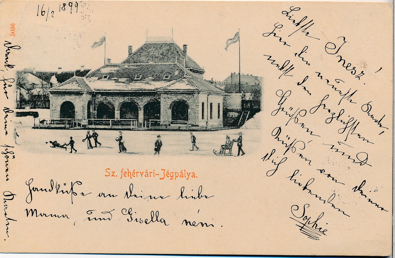 A visszaemlékezés így folytatódik: „Persze a felnőtteknek is volt diszes korcsolyapályájuk, a mostani száraz sportpálya eredetileg korcsolya /nyáron tenisz/ pálya volt. Régi öltöző épületében katona zenekar fújta a keringőket a bógnizó párok számára. Ott gyereknek nem volt keresni valója.” A bógni szó talán némi magyarázatra szorul. A sportkifejezés korcsolyával leírt félkört jelent. S hogy hol táncolhattak a jégen a helyi felnőttek? Erre az idősebbek biztosan tudják a választ: a Gödörben, a városi strand szomszédságában. Bizony, itt volt valamikor a Korcsolyázó Egylet által kialakított pálya, gyönyörű főépület is tartozott. Ezt láthatjuk egy 1899-ben keltezett, Klökner Péter könyv- és zeneműkereskedő által kiadott képeslapon. Érdemes megfigyelni a rajzolt figurákat, a csúszkálókat, az orra bukót és a fakutyázókat. Egyébként nemcsak a jégen lehetett kecsesen siklani vagy éppen botladozni. A társasági életet színesítették a városi közönség örömére rendszeresen megszervezett korcsolyabálok.