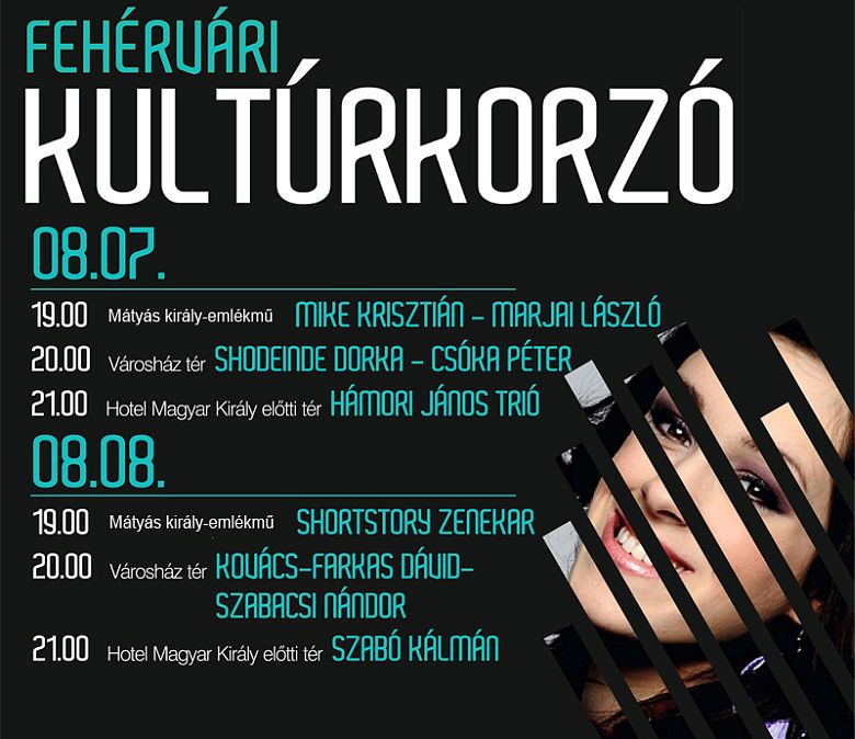 A Belvárosban utolsó állomásához érkezett a péntek és szombat esték nyári szabadtéri programja, a Fehérvári KultúrKorzó. Augusztus 7-én, pénteken a Mátyás Király-emlékműnél 19 órától Mike Krisztiánnal és Marjai Lászlóval találkozhat a közönség, majd 20 órától a Városház téren Shodeinde Dorka énekel, gitáron kíséri Csóka Péter. A Hotel Magyar Király előtti nagyszínpadon a Hámori János Trió zárja a Korzót 21 órától.