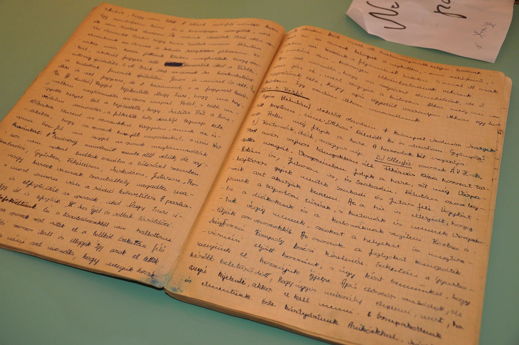 „1956. szeptember 1-jén kezdtem naplót írni, akkor költöztünk Balatonfűzfőre. Elég magányos voltam ahhoz, hogy leírhassam, elmondhassam gondolataimat. Október 23-tól már tudatosan jegyzeteltem. Ahogyan visszaemlékszem, rendkívül örömteli esemény volt a fiatalok számára. Mindenki próbált valamit csinálni, valamit változtatni a zsarnokságon. Meghatározó emlékem a veszprémi gimnazisták tüntetése, amelyről írtam is, hogy soha nem felejtem el.” – fogalmazott Dr. Vajda Jenőné Németh Terézia, a napló szerzője.